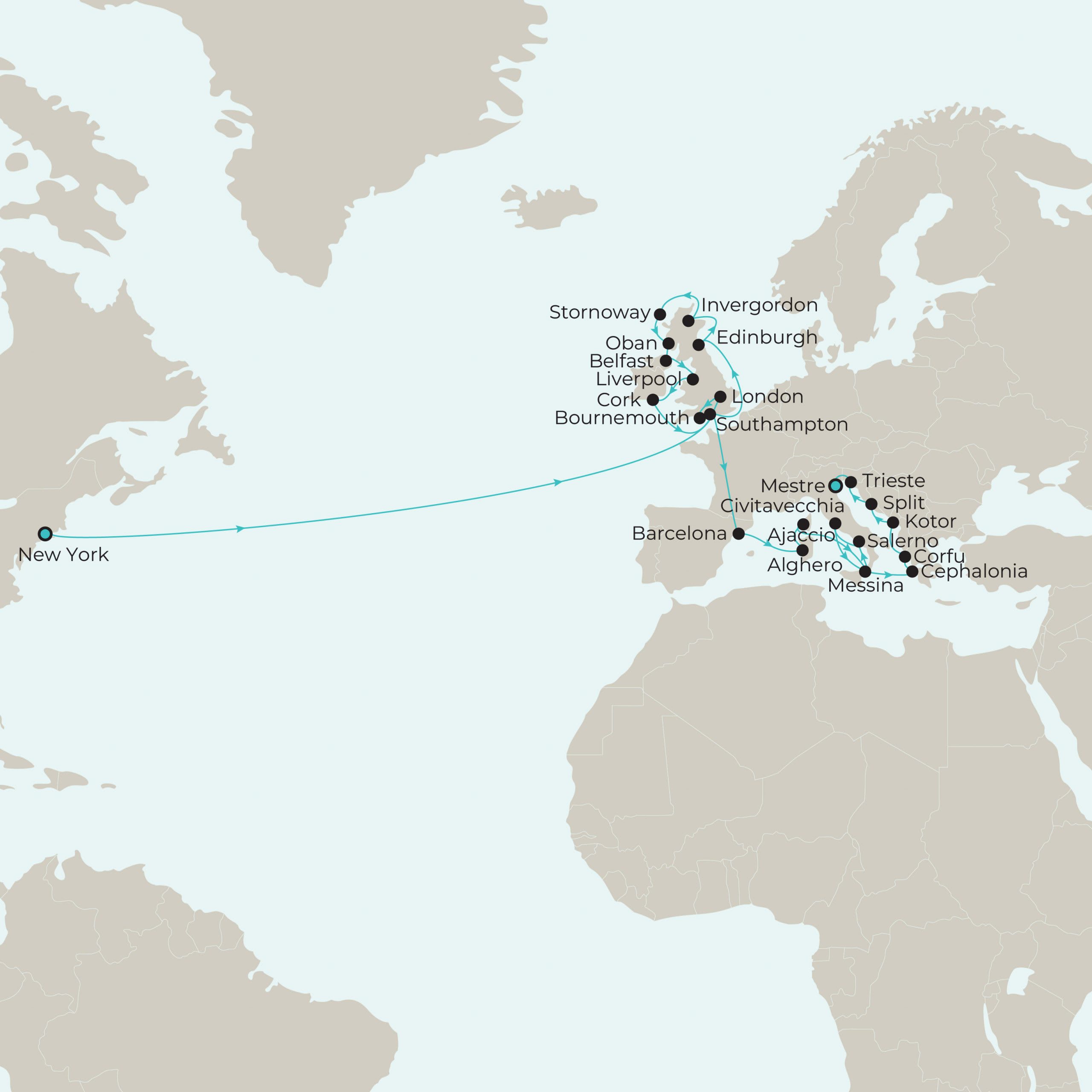 From Scotland’s awe-inspiring landscapes and Britain’s rich history to Italy’s timeless allure, Greece’s vibrant islands, and a legendary Transatlantic crossing, set sail to some of the world’s most desirable destinations, where each day offers a feast of new experiences. Throughout this remarkable experience, you’ll also enjoy hand-picked hotel stays in New York, London, Bournemouth, Barcelona, and Mestre, ensuring every moment is infused with unforgettable memories.